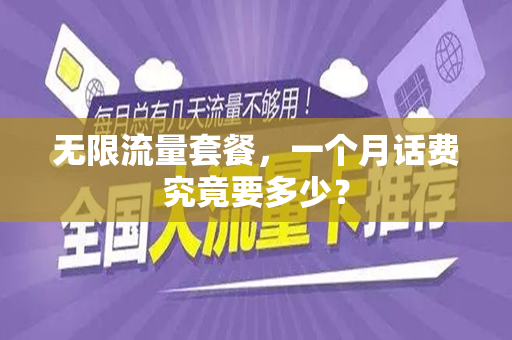 根据以上因素,无限流量一个月的话费因地区、运营商、套餐类型、用户使用情况等因素而异,在一线城市,无限流量套餐的话费可能在几百元至数千元不等;而在二线、三线城市及乡村地区,话费可能会相对较低,具体话费还要根据用户所选择的套餐类型、附加服务以及使用情况进行计算。